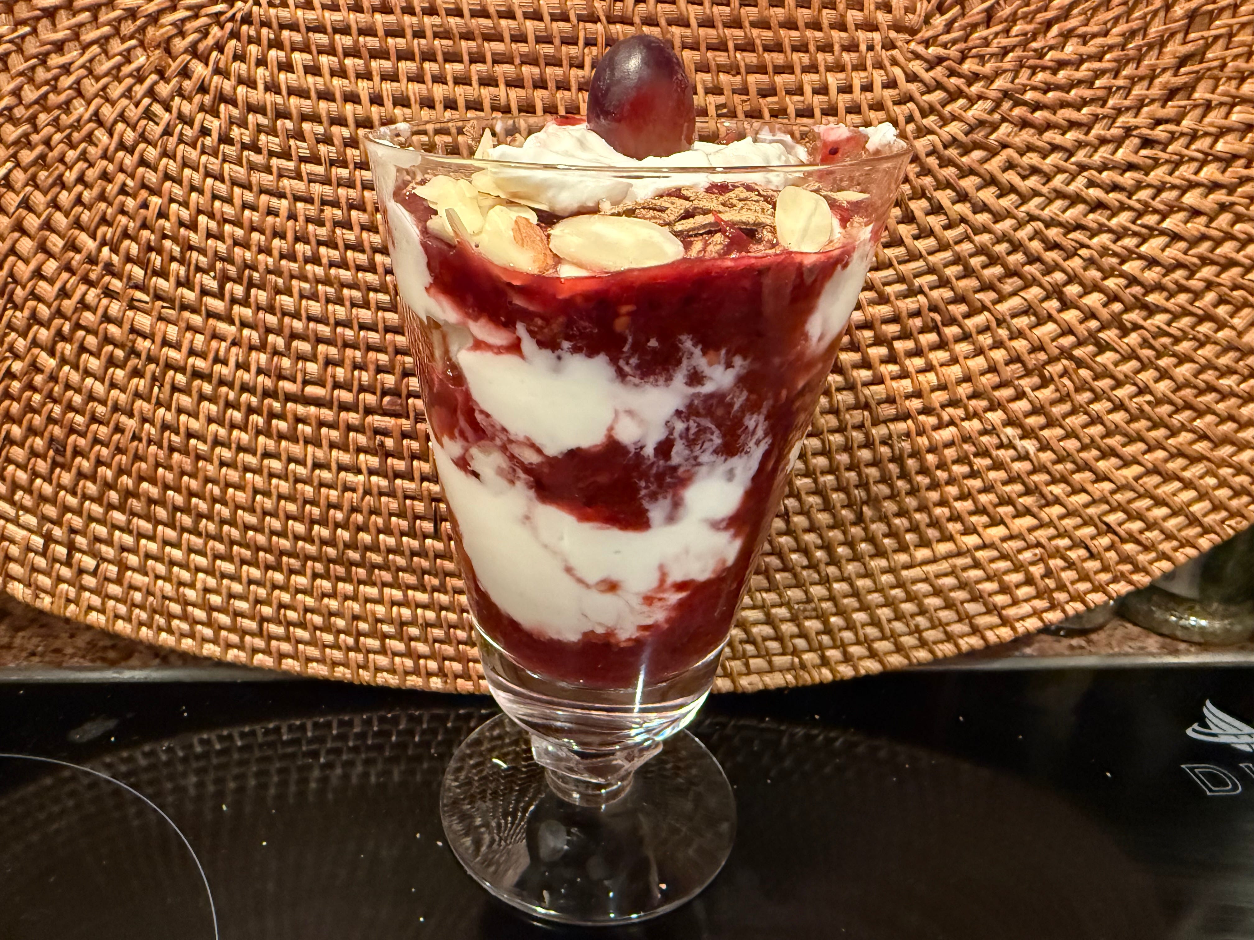 Next, I layered the fruit sauce with Greek yogurt, topped it with some slivered almonds and a little All-Bran for crunch, plus a grape on top.